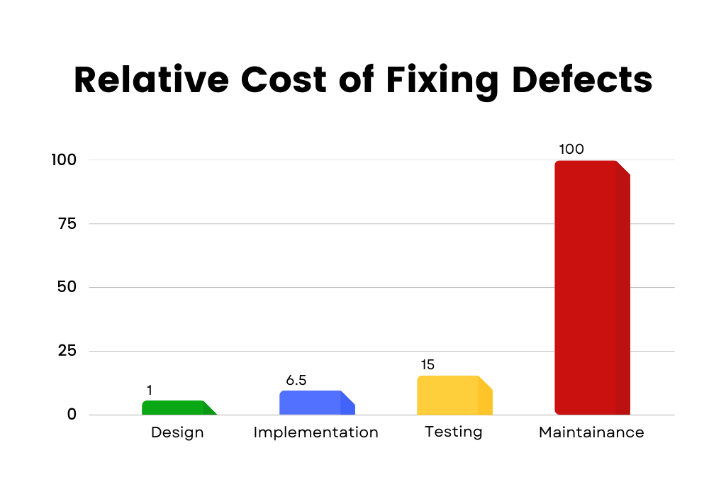 The cost of fixing defects during maintenance is 100 times higher than during the design phase and five times higher than during testing.