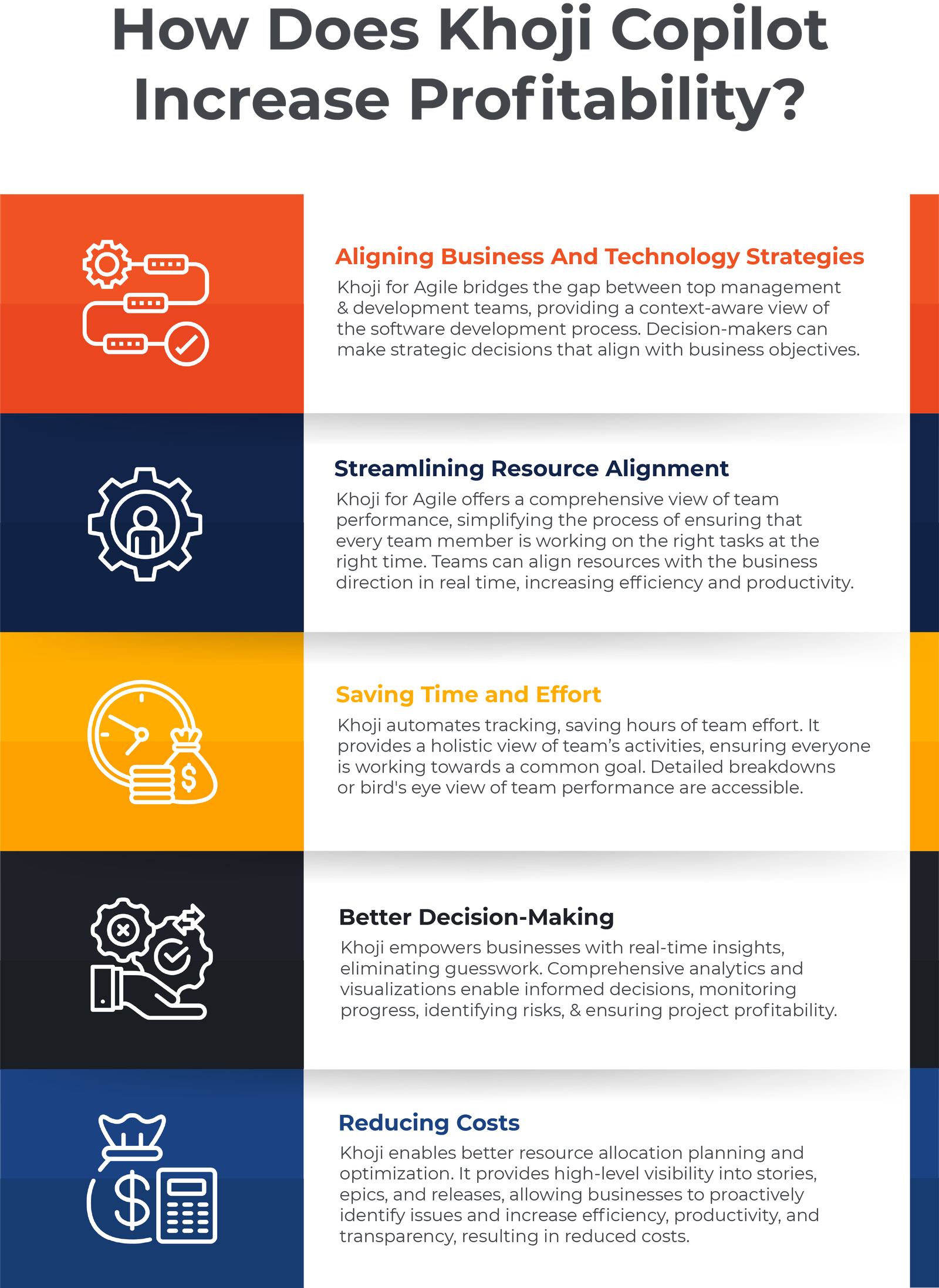 Ultimately, the implementation of Khoji Copilot leads to increased profitability for software projects. By aligning business and technology strategies, streamlining resource alignment, saving time and effort, making better decisions, and reducing costs, companies can deliver higher-quality software products faster and more efficiently. This translates into improved customer satisfaction, increased market share, and ultimately, higher revenues and profits.