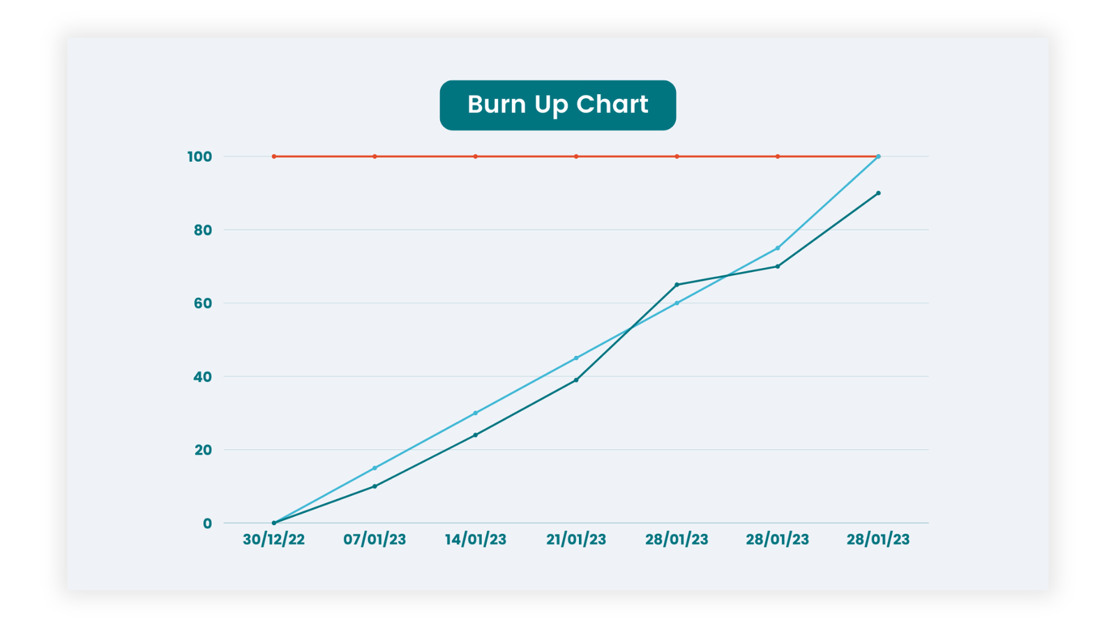 3- Spotlights changes in scope and controls scope creep: Unlike burn down charts, burn up charts make it easy to track any changes in project scope. This helps you avoid letting the project grow too big without noticing.