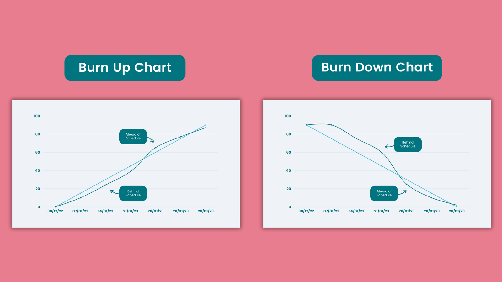 Burn up and burn down charts are both handy tools in project management, showing progress visually over time. But there are clear distinctions between the two.