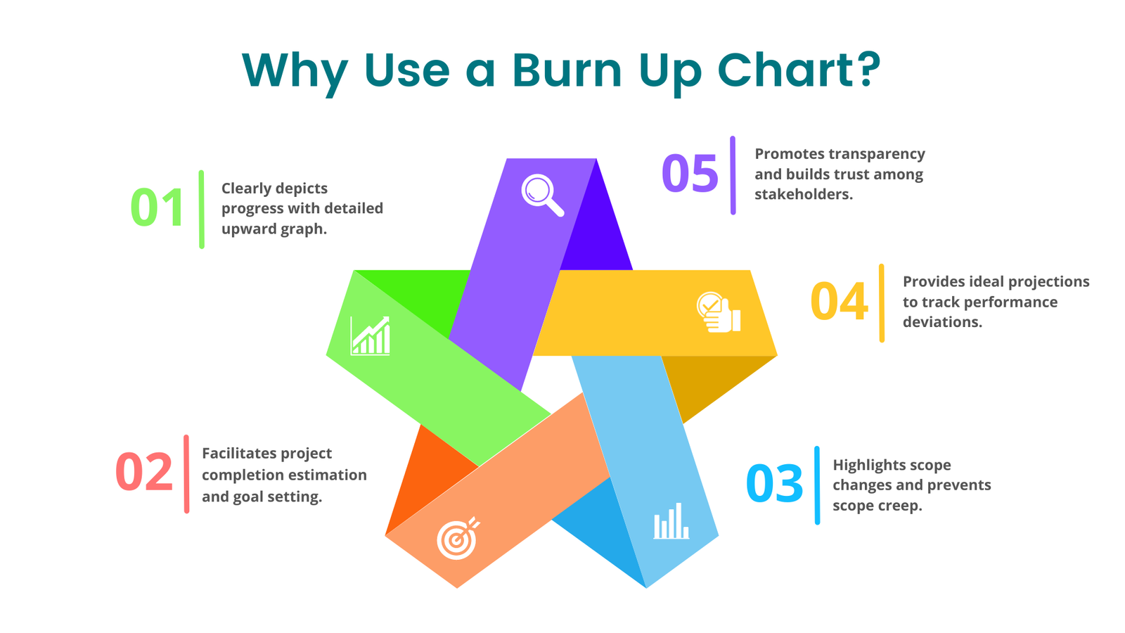 5- Promotes transparency: Burn up charts are easy to understand and help everyone involved in the project see how things are going. This transparency builds trust, especially when working with clients.