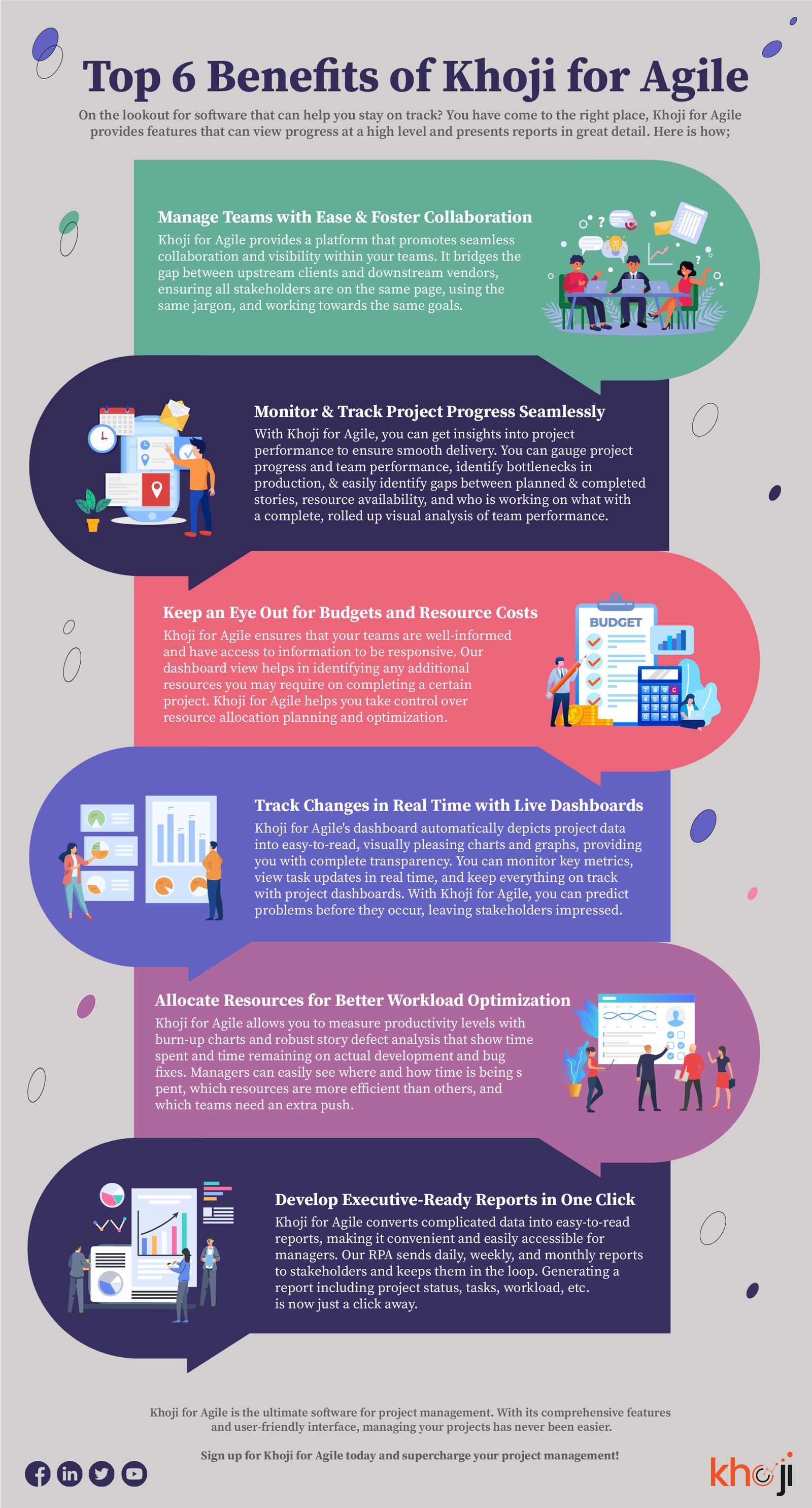 Khoji for Agile is a comprehensive project management tool that provides real-time insights and information accessibility to empower you to make data-driven decisions. See the infographic below for the top six benefits of using Khoji for Agile for effective project management.