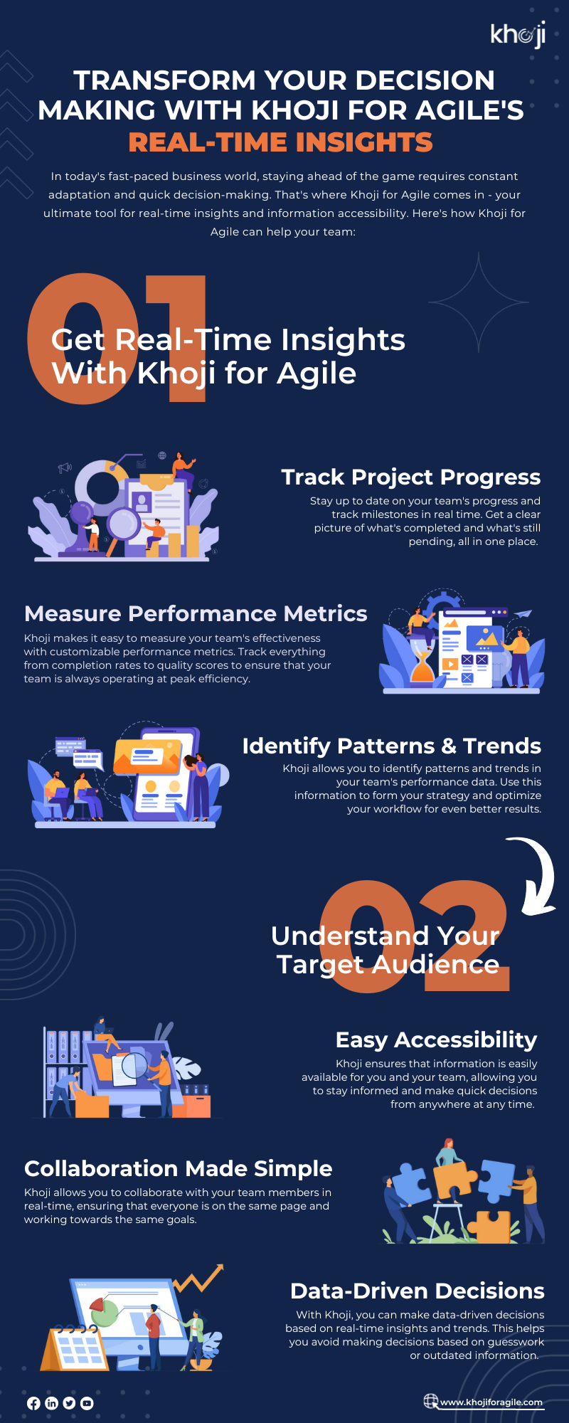 In today’s fast-paced business world, staying ahead of the game requires constant adaptation and quick decision-making. Khoji for Agile is the ultimate tool for real-time insights and information accessibility, empowering you to transform your decision-making process and take your team’s performance to the next level. This Infographic highlights how Khoji for Agile’s real-time insights revolutionize your decision-making process, enabling you to track project progress, measure performance metrics, and make data-driven decisions with ease.