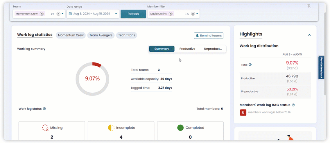 - Efficient Time Management: Automated notifications free up managers’ time, allowing them to focus on strategic tasks instead of chasing work logs.
